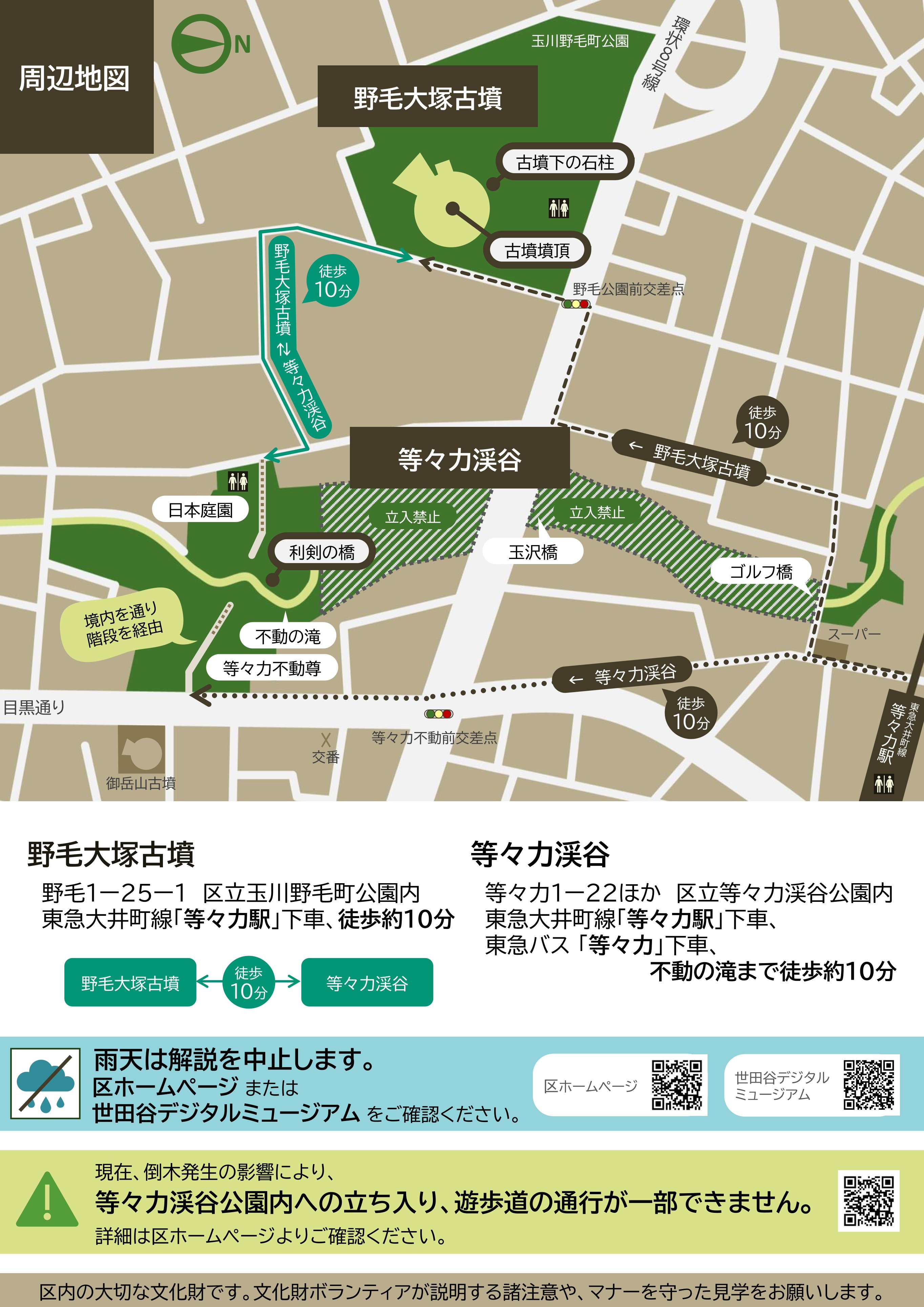・文化財ボランティアは「文化財ボランティア」と書かれたベストを着用または登録証を携帯して解説します。 ・等々力渓谷内には湧水箇所があり、足場の悪い場所がありますので、お気を付けください。 |