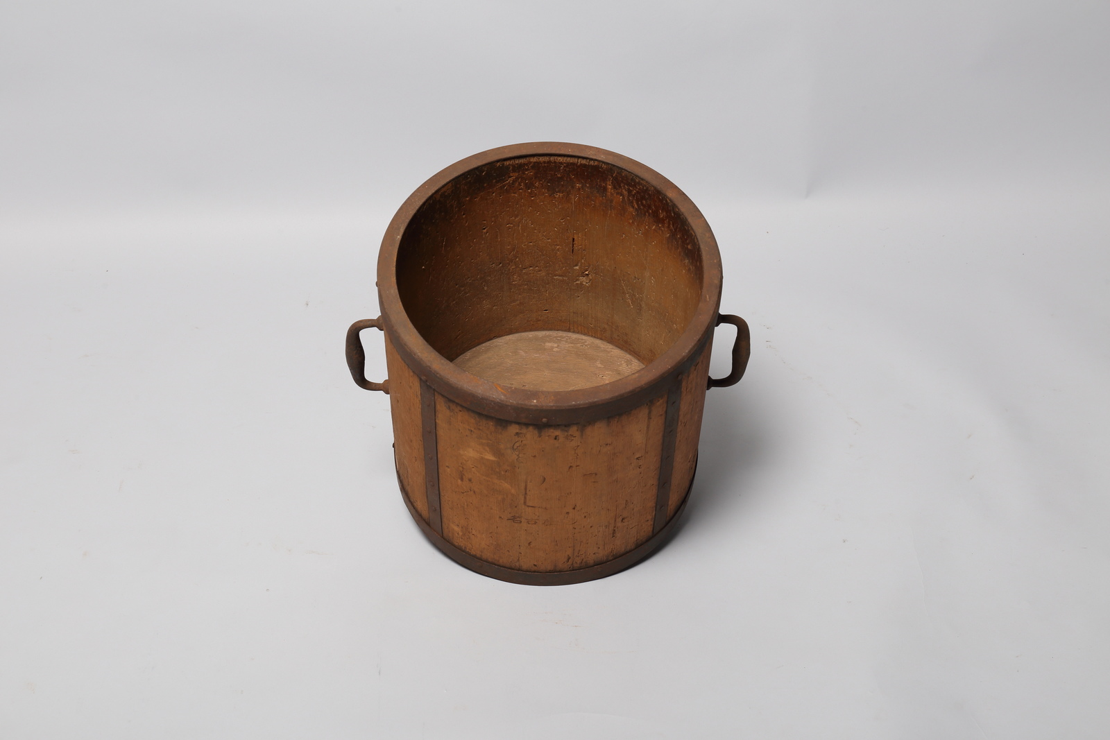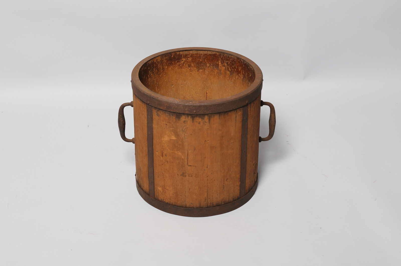 米などの穀物を図る1斗(18L)用の円筒形の計量容器。口縁と底縁に鉄輪を当てて固定し、くわ板の継ぎ目の数カ所に鉄板を当てて補強し、左右の側に握り手がついている。唐箕の注ぎ口に穀粒を落としたり、籾を筵に広げて乾燥するときなど、おおよその量を量りながらの作業にも使われた。