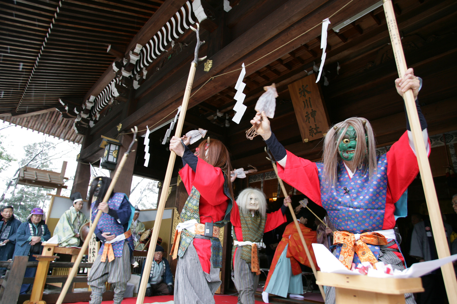 喜多見氷川神社では社殿で祝詞が上奏されたのち、神官と赤・青・白・黒の鬼の間で「鬼問答」が行われる。この問答のすえ、鬼たちは神官にスルメを与えられ「鬼は外」との掛け声とともに豆を投げつけられ退散していく。鬼が去った後は、かわって大国(だいこく)様(大国主命)と恵比寿様が昇殿し舞を舞いながら祝詞を奉上する。