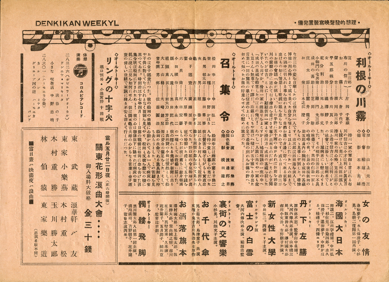 公開中(昭和10年5月16日~22日)「利根の川霧」「召集令」「リングの十字火」(22日夜)関東花形浪曲大会