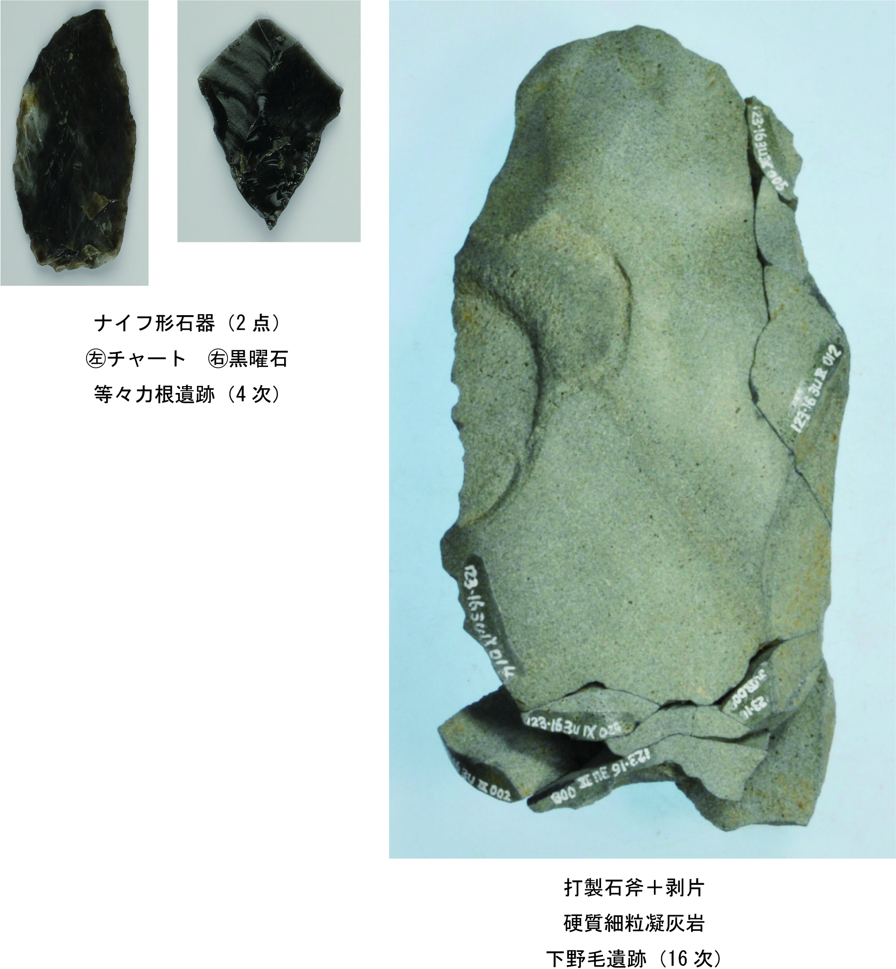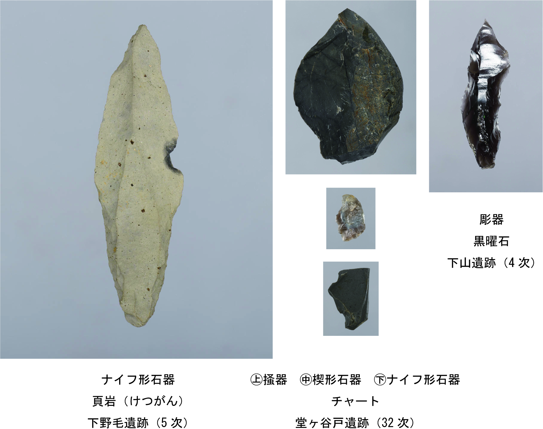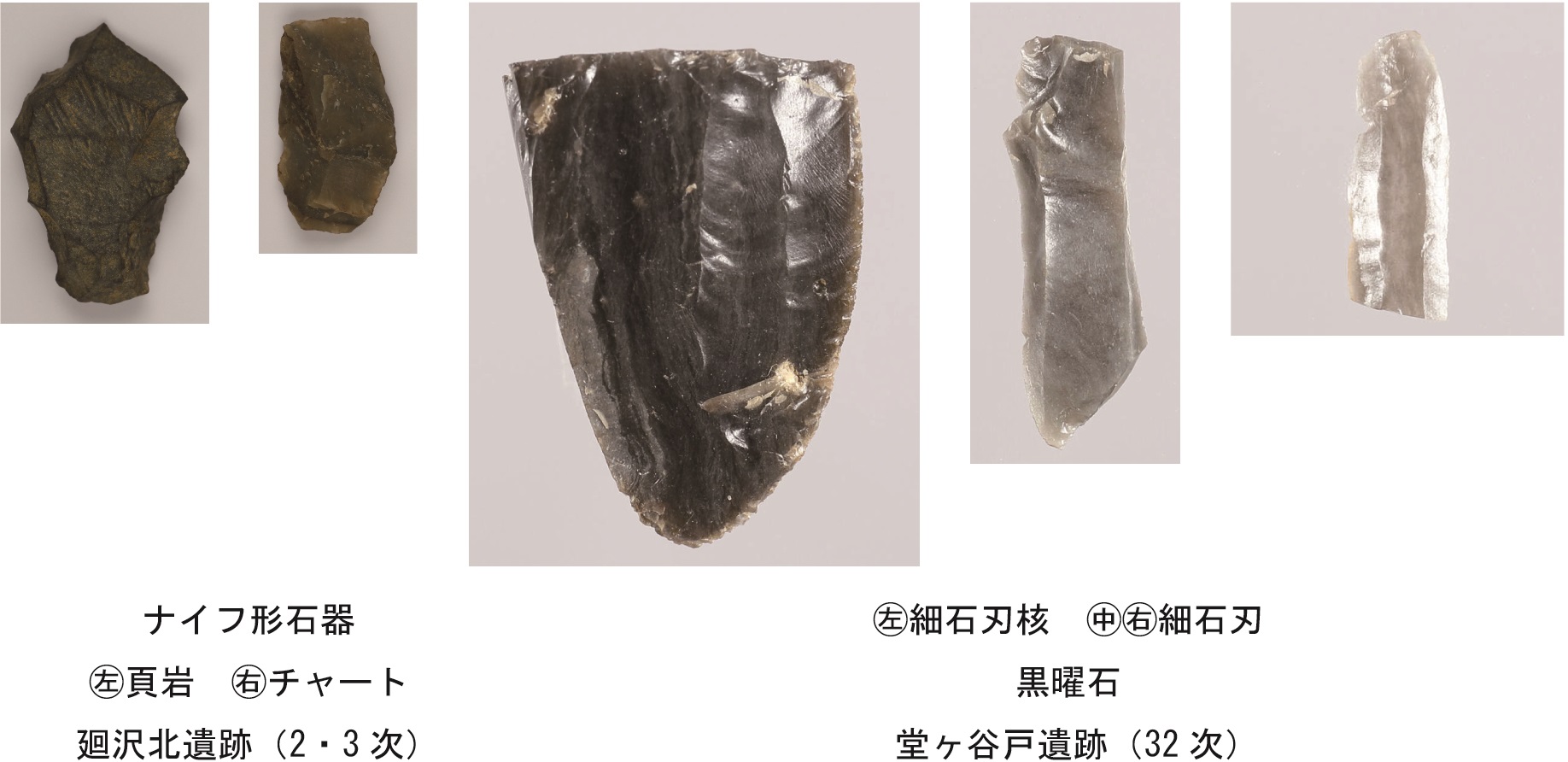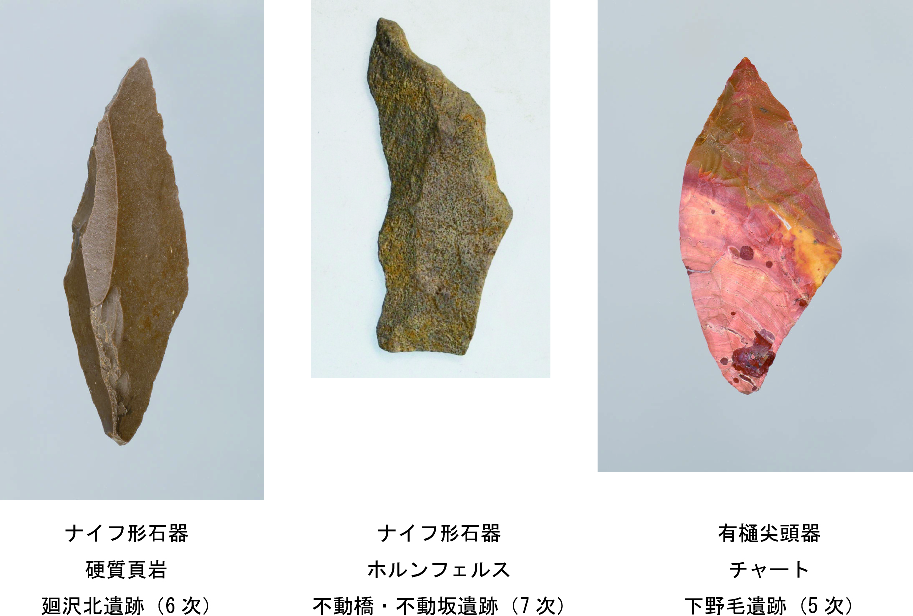 打製石斧を伴うナイフ形石器文化からはじまり、旧石器時代最終末期のⅢ層からは細石器文化に移行します。