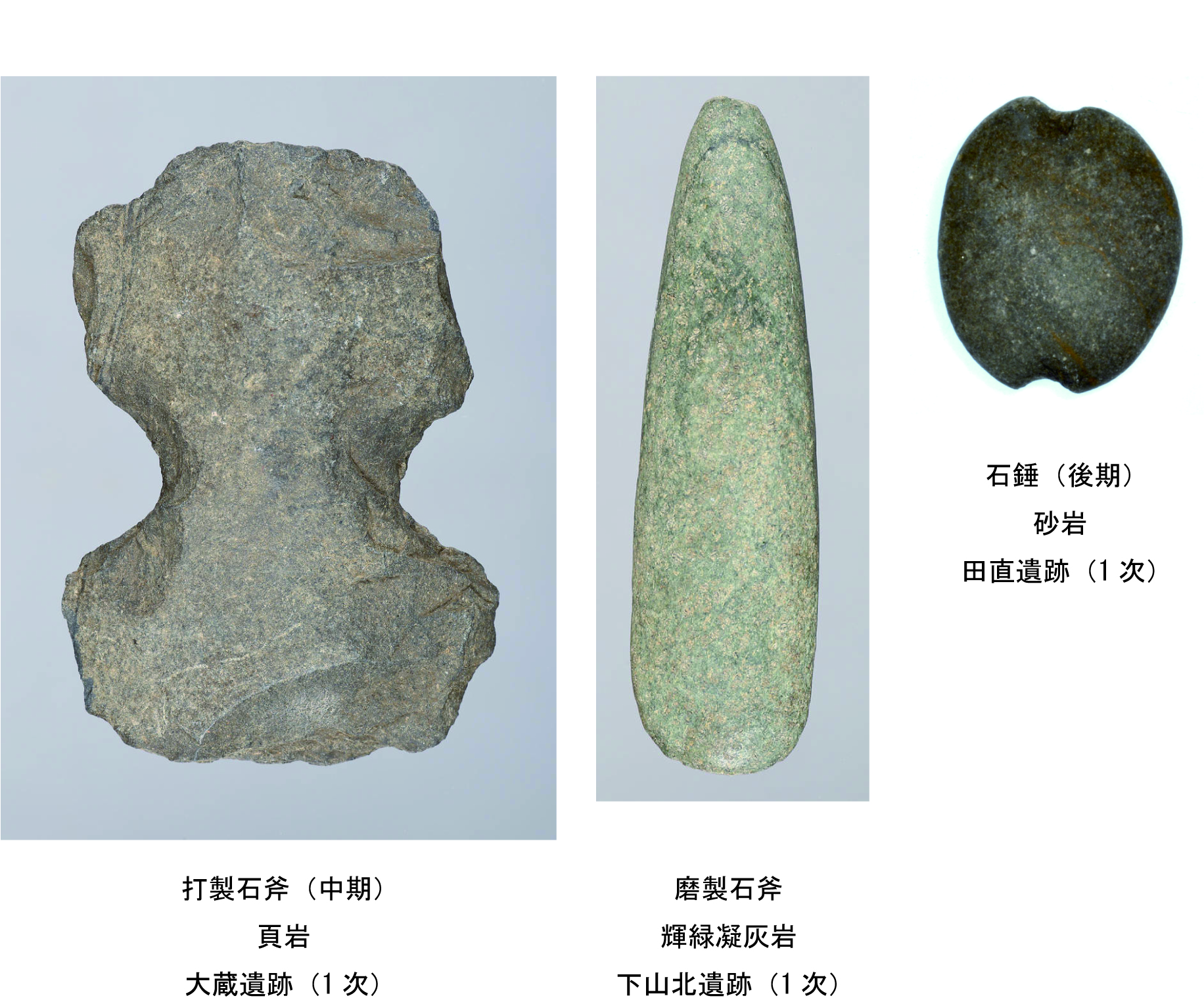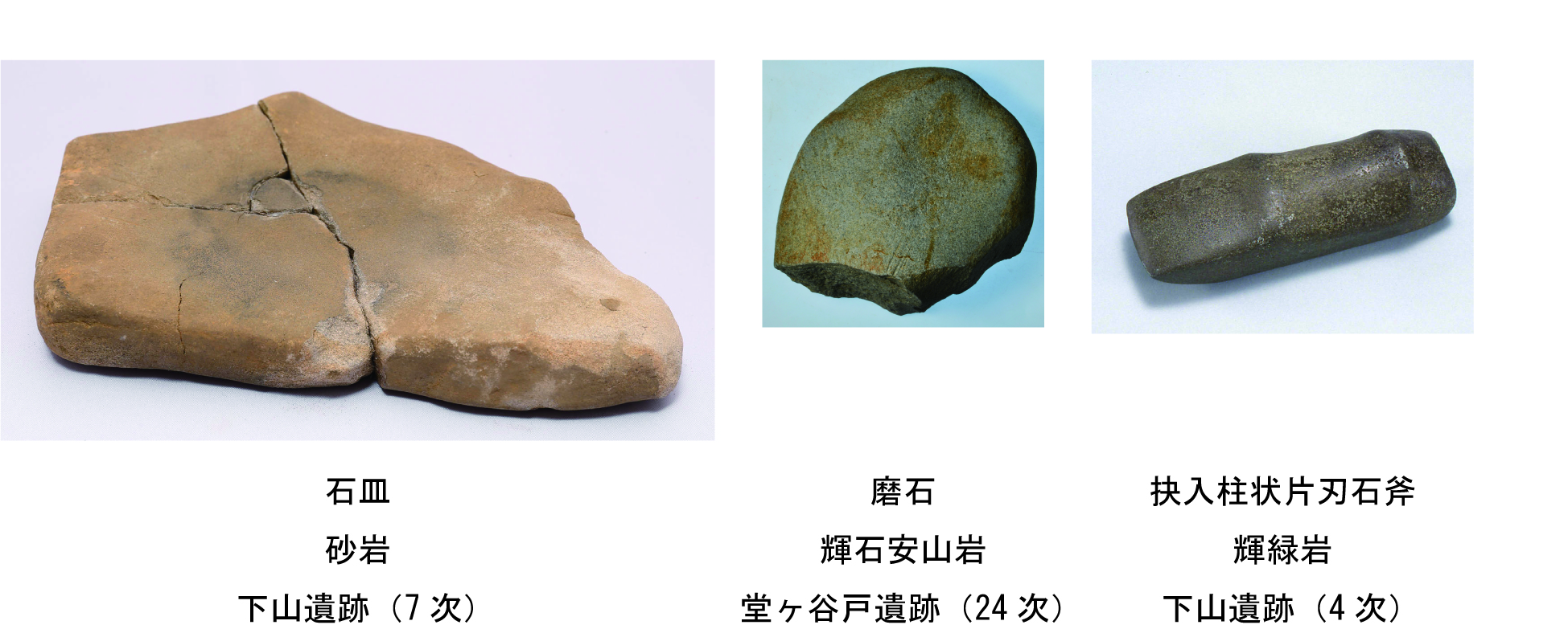 地面を掘り込んで作った住居跡や土坑から石器が出土する場合や、明確な遺構に伴わず遺物包含層であるⅡ層中から石器が出土する場合があります。 下山北遺跡出土の磨製石斧は輝緑凝灰岩(きりょくぎょうかいがん)が使用されています。