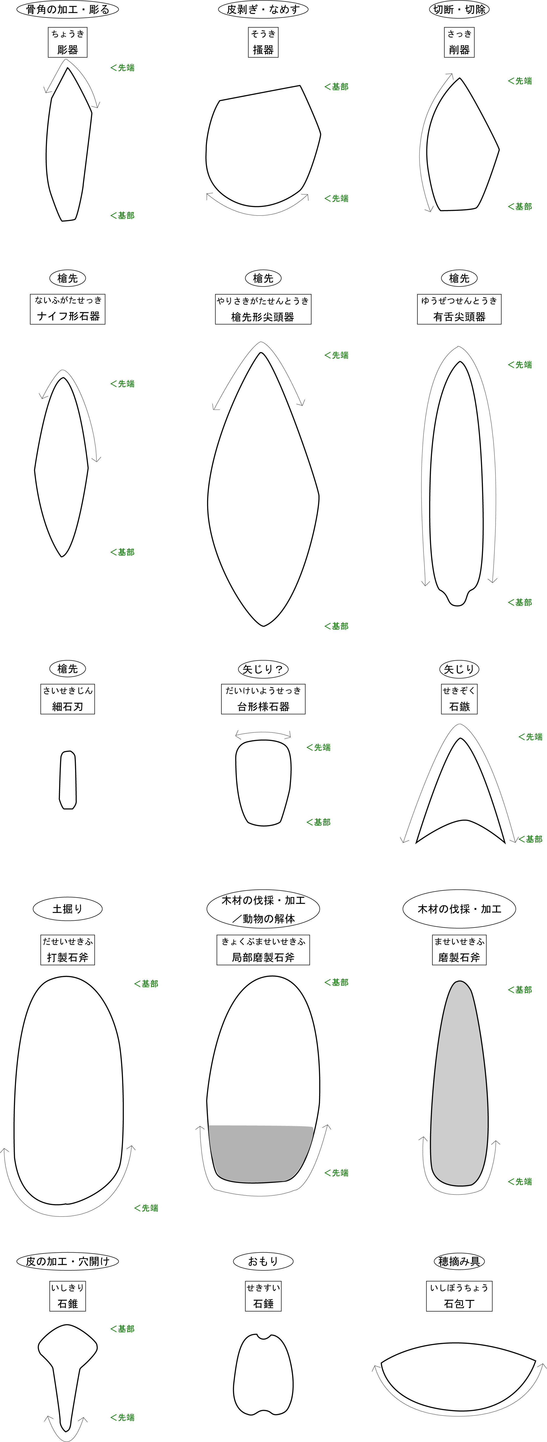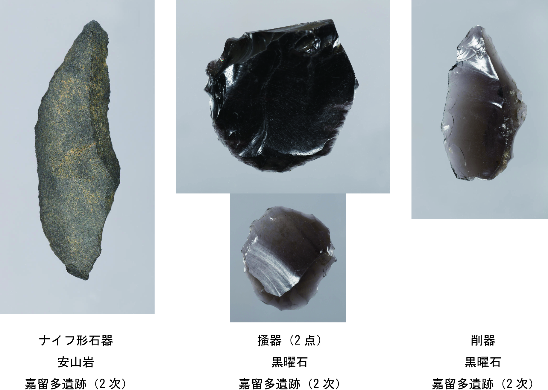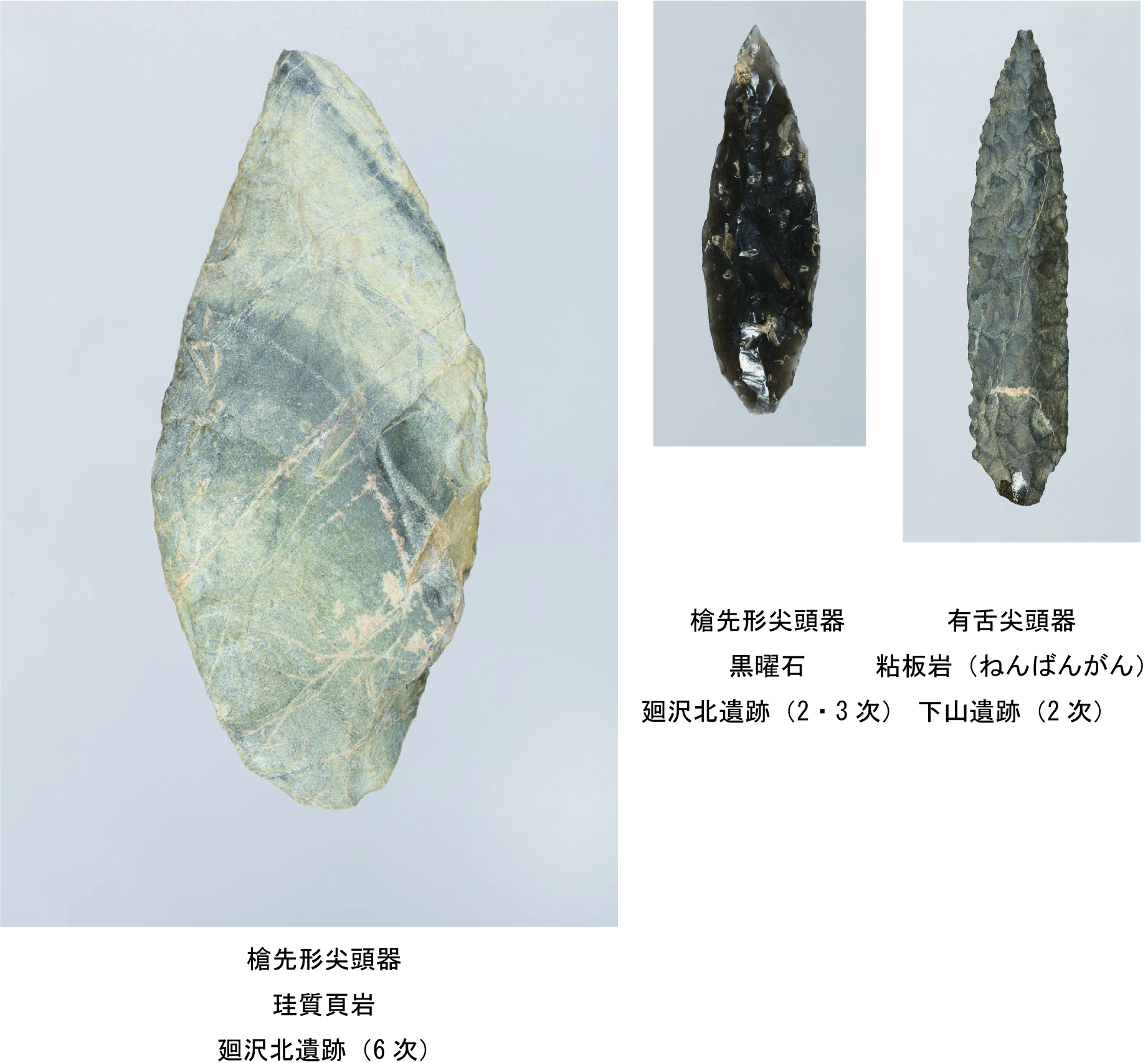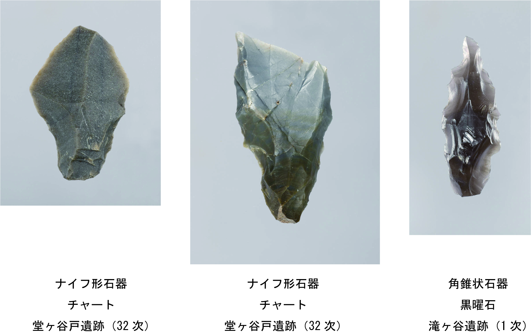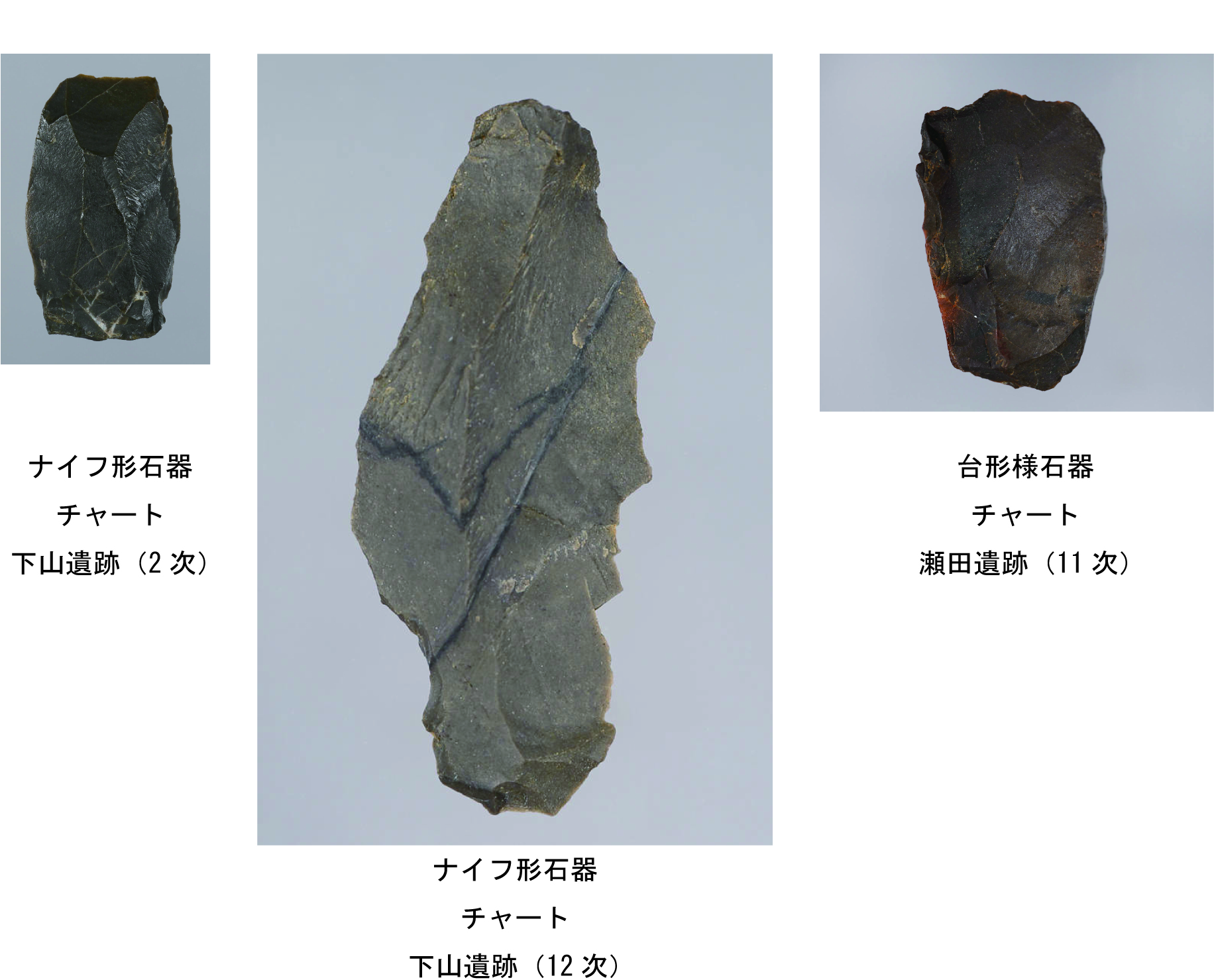 その間、石器の器種自体時代によって新たに出現したり消滅したりと変化があり、それぞれの器種の形そのものも時代によって石材や打ち割り方・磨き方が変化していきます。