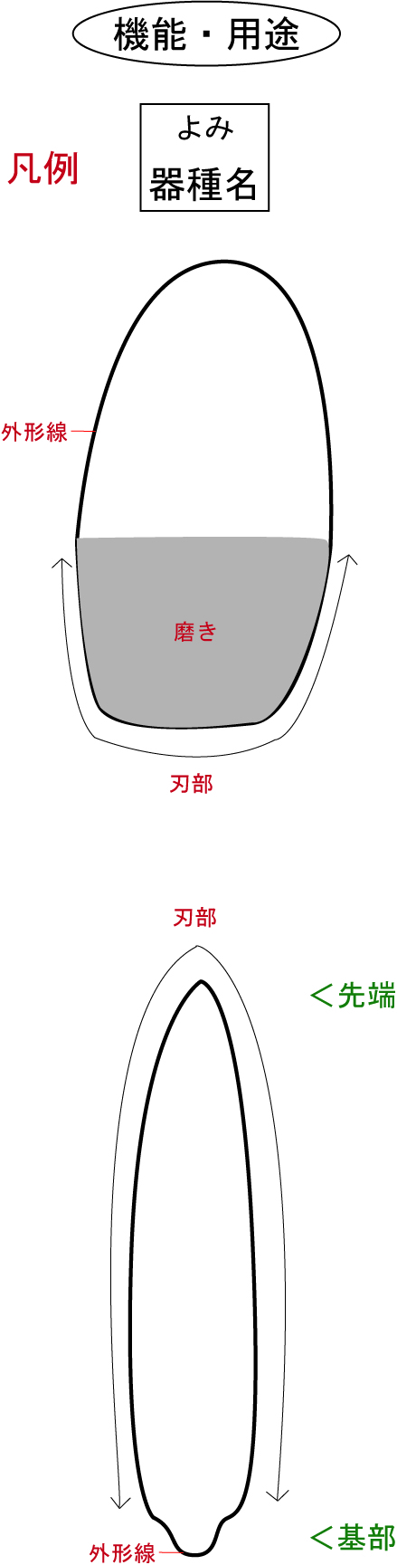 石器の形の種類。外形や寸法、刃部の位置や調整方法などで区別します。 石器(れきせっき)があります。 |
