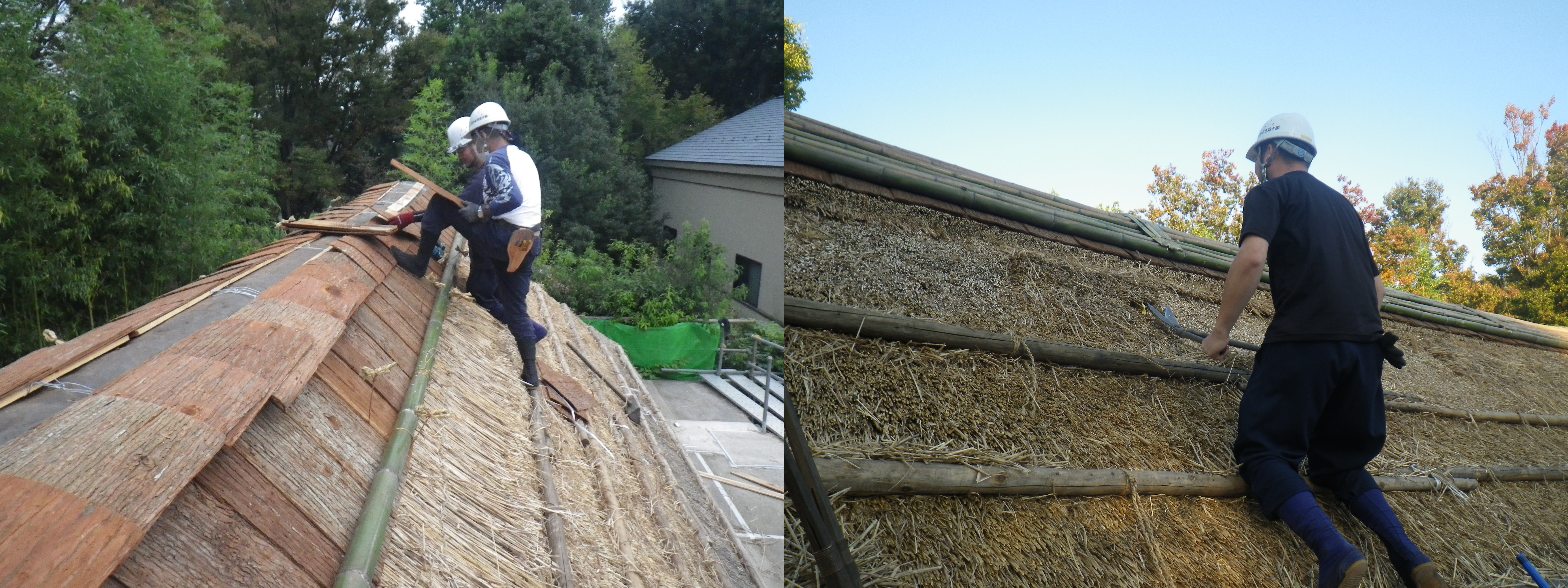 旧谷岡家住宅表門では、移築工事の際にススキの入手が難しかったことから、既存の茅は主にヨシで構成されていました。ただし、世田谷地域では、茅にはヨシよりもススキの使用が高かったことから、今回の工事では、新しく追加する茅にはススキを使用しました。ヨシは比較的葉が少なく固い素材である一方で、ススキはヨシに比べると柔らかい素材です。屋根に異なる種類の茅を混ぜて葺いた場合、柔らかい茅に雨水が流れやすくなるため、固い茅に比べて柔らかい茅の部分の劣化の進行が早くなり、屋根表面に凹凸が生じることが分かっています。屋根表面の凸凹が生じると、水が凹んだ箇所に集中していくため、局所的に屋根の傷みが進行しやすくなります。