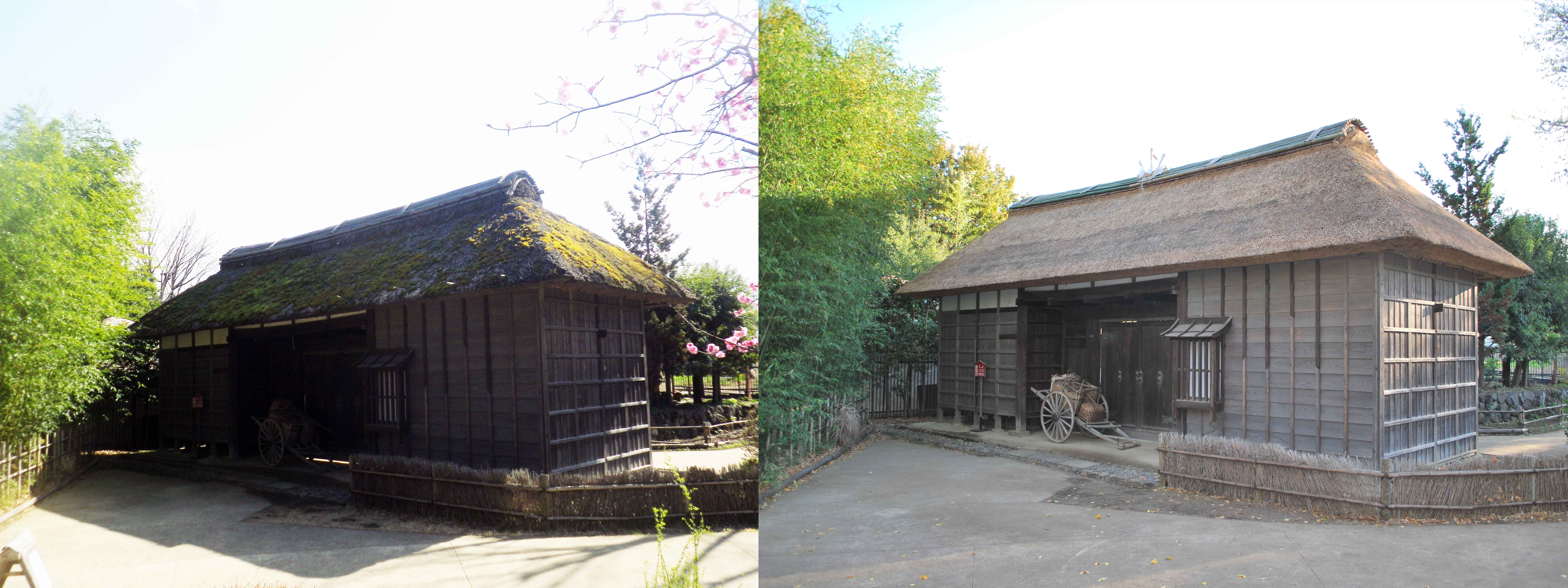 茅葺き屋根の「茅」とは、屋根に使われる草類(ススキやヨシなど)の総称で、屋根を覆いつくることを「葺く」といいます。日本では古くから草を材料とする茅葺きの屋根がありました。また、世田谷地域では、茅にススキや麦からを使用した茅葺き屋根がありました。