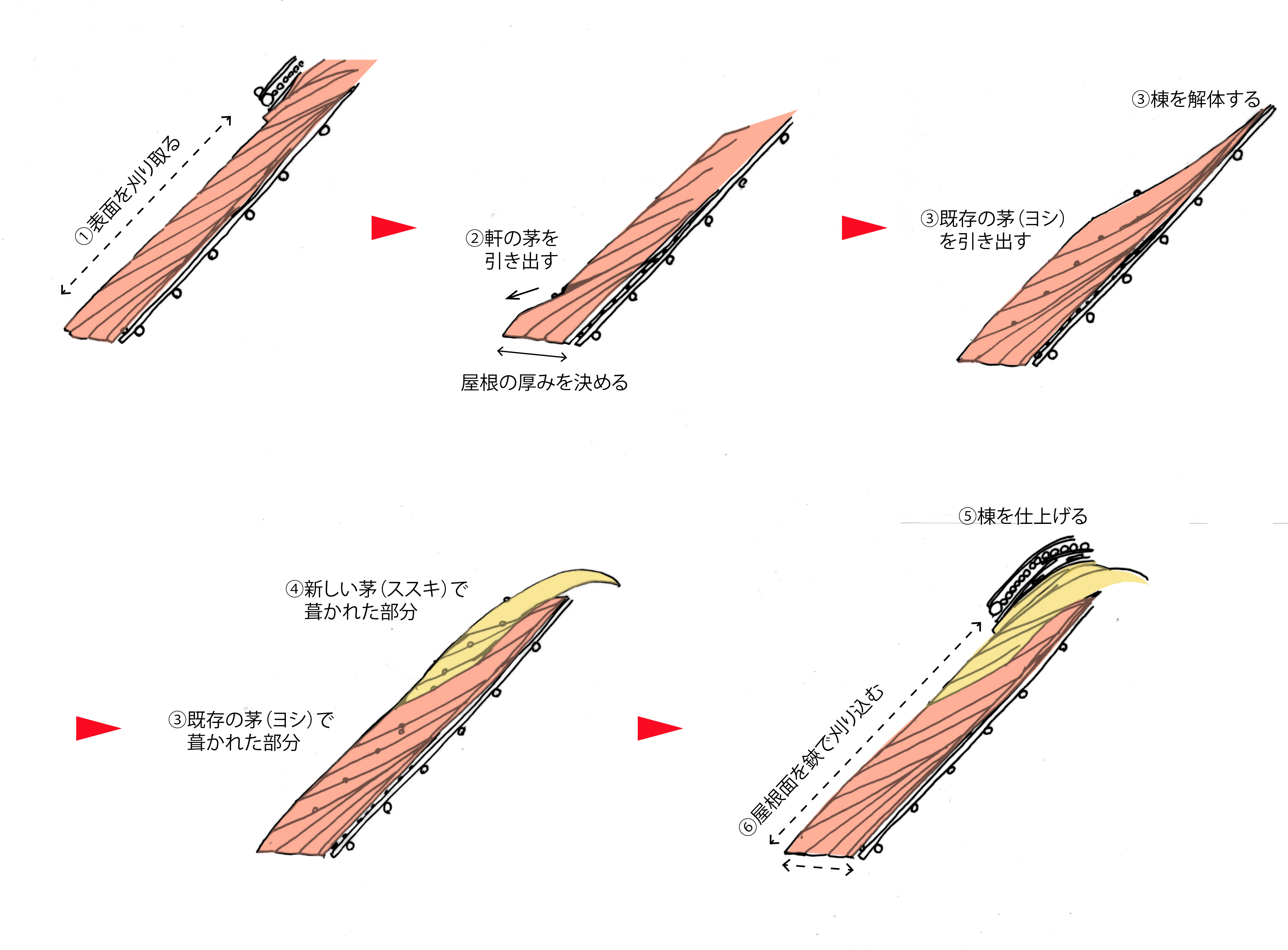 ④既存の茅(ヨシ)を引き出した上に、新規の茅(ススキ)を葺いて屋根面を仕上げます。