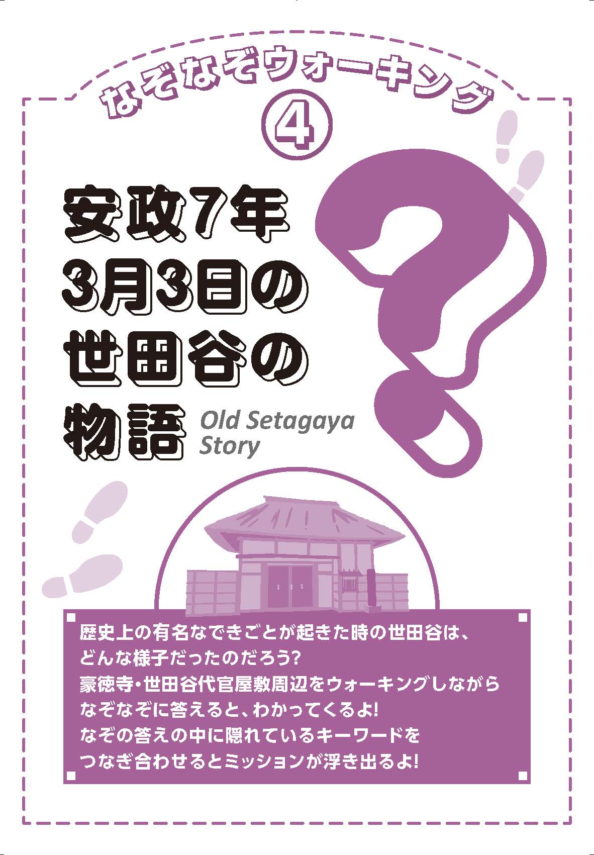 世田谷区には、地域の歴史文化を物語る文化財が数多くあります。こうした文化財は世田谷に暮らしてきた人々の記憶を伝える貴重な財産です。文化財をこれからも守り、伝えていくために、「せたがや歴史文化物語」として、まち歩きとワークショップを行っています。参加者の皆様からのアイデアをもとに、これまでに『なぞなぞウォーキング』を3冊発行してきました。